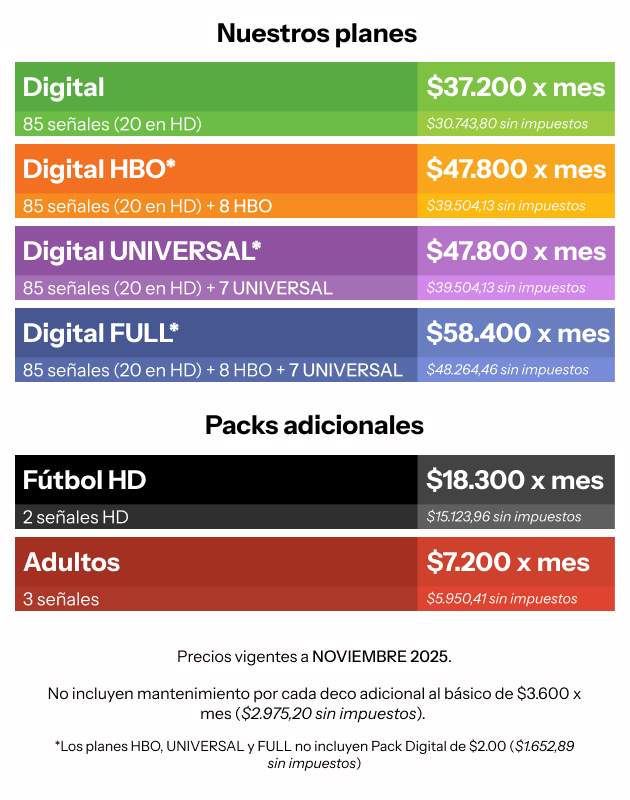 $8.500 ($7.024,79 sin impuestos) mensuales + $3.600 ($2.975,20 sin impuestos) mensuales por cada deco adicional.