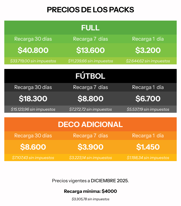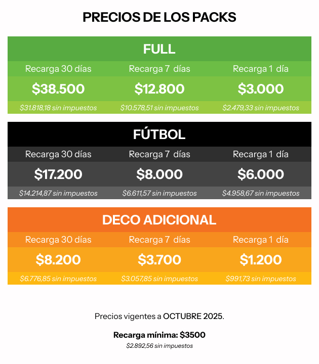 Recordá que Plan Fútbol HD y Plan Deco Adicional son siempre adicionales a tu plan Full. Esto significa que para poder ver la programación de estos packs deberás contar siempre con saldo activo en tu Plan Full.